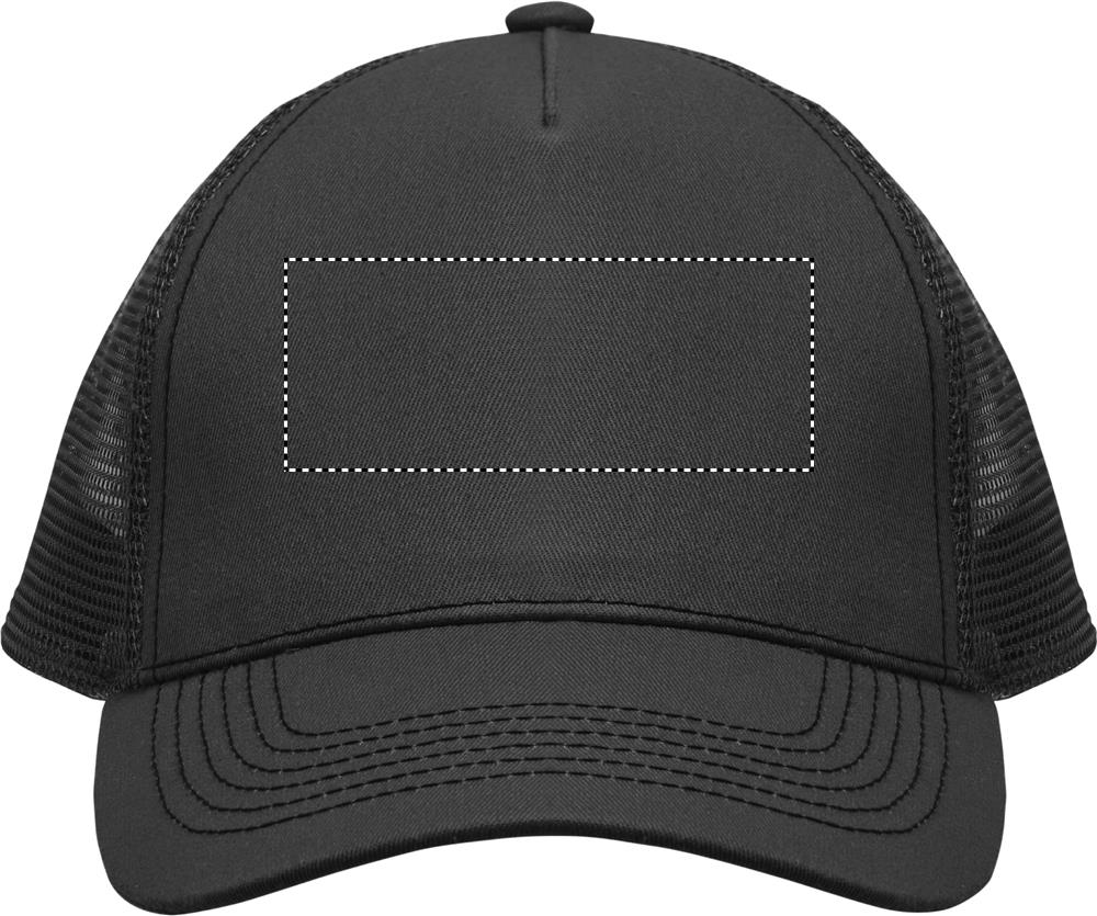 5 panelen trucker cap met voorpaneel en vizier in 250g/m² katoen, achterkant van polyester mesh, klittenbandsluiting.