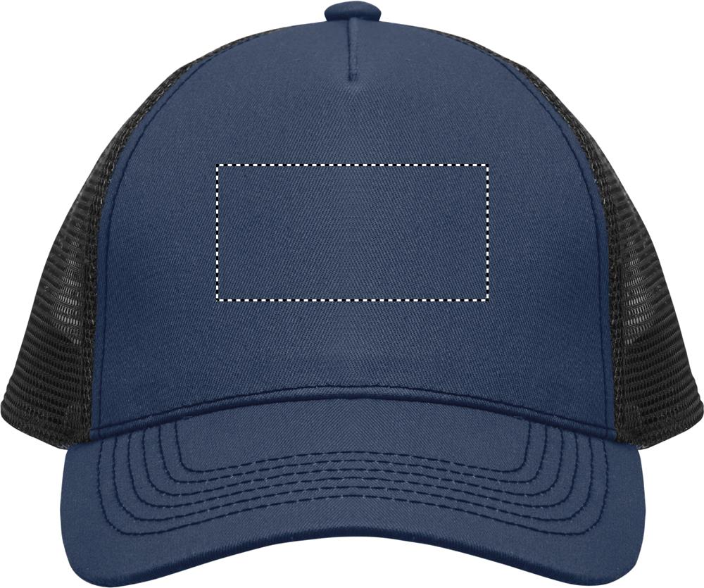5 panelen trucker cap met voorpaneel en vizier in 250g/m² katoen, achterkant van polyester mesh, klittenbandsluiting.