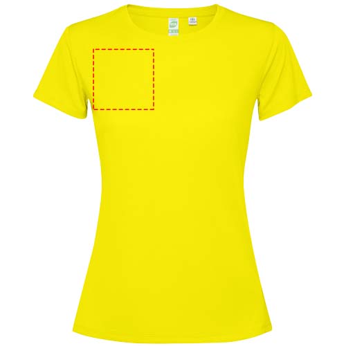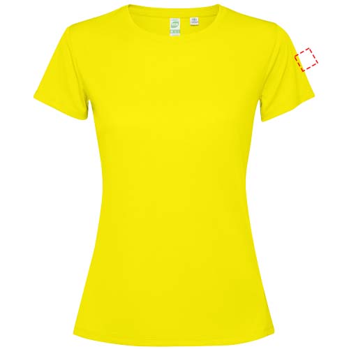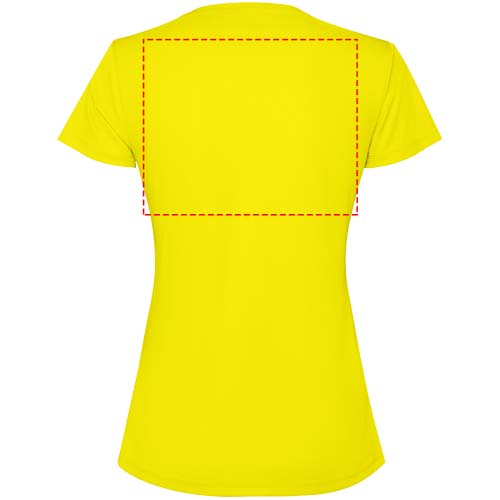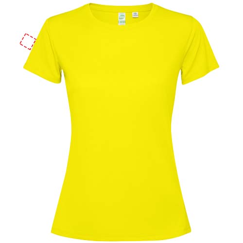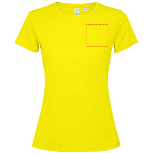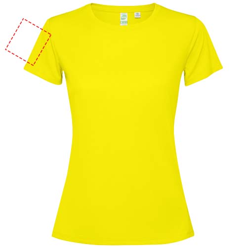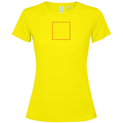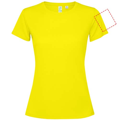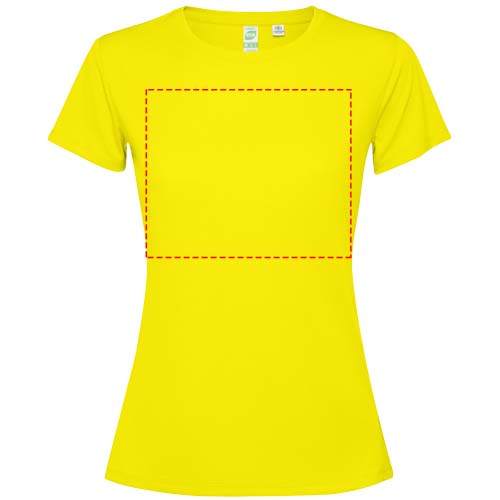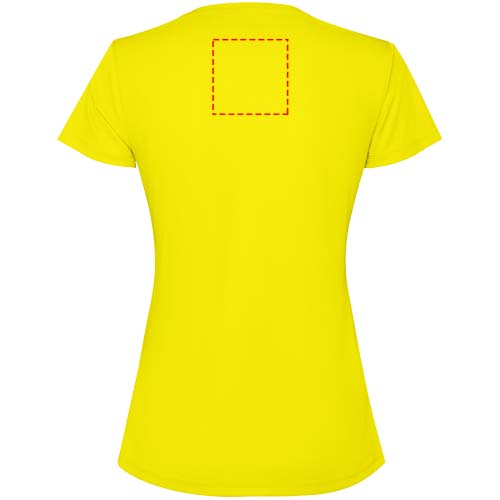 Getailleerd technisch T-shirt met korte mouwen voor dames. Kraag met bijpassende naden. De zoom aan de achterkant is iets langer dan aan de voorkant. Zijnaden naar voren verschoven.