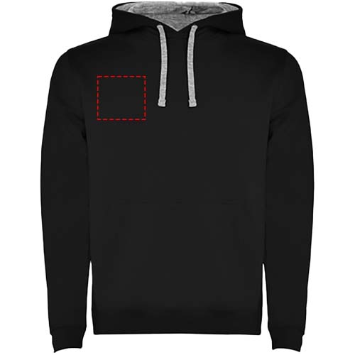 Kapuzenpullover mit doppeltem Stoff, verstellbarem Kordelzug in Kontrastfarbe, verstärkten und verdeckten Nähten am Kragen und Kängurutasche. Verfügbar in Zweifarbig und Uni. Elastischer 1×1-Rippstrick an Ärmeln und Bund. Abnehmbares Etikett. Das Modell ist 185 cm groß und trägt Größe M.