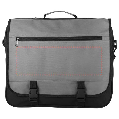 Exhibition bag with adjustable shoulder strap, buckle closure flap, zipper pocket in flap, zippered main compartment and several open pockets under flap.