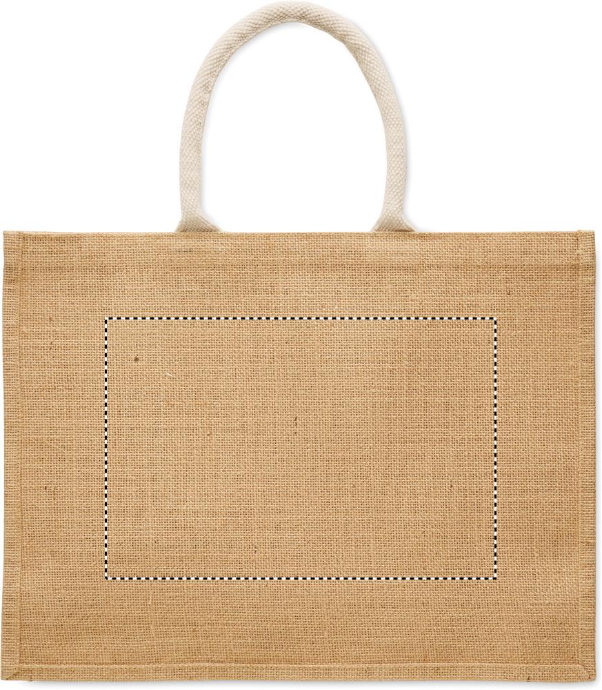 Shopping bag made of laminated jute and 280 gr/m² cotton canvas with cord handles. Includes large open front pocket.