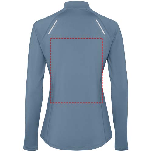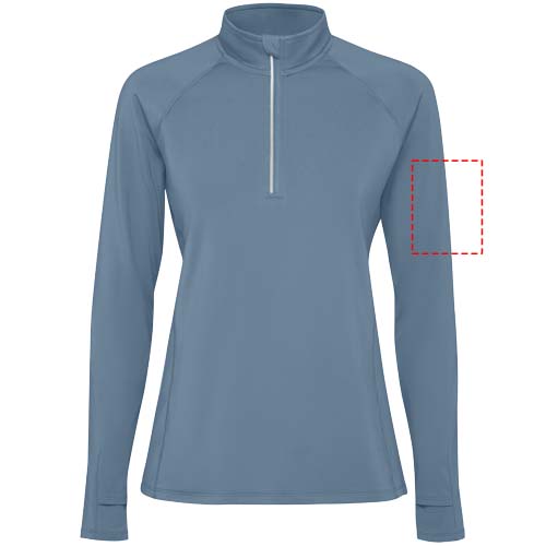 Long-sleeve technical raglan sweatshirt for women. Slim-fit. Collar with a half zip inverted design featuring reflective details. Reinforced seam covers. Cuffs with thumb openings. Reflective details on the back. Back hem slightly longer than the front. Warm brushed inner fabric.