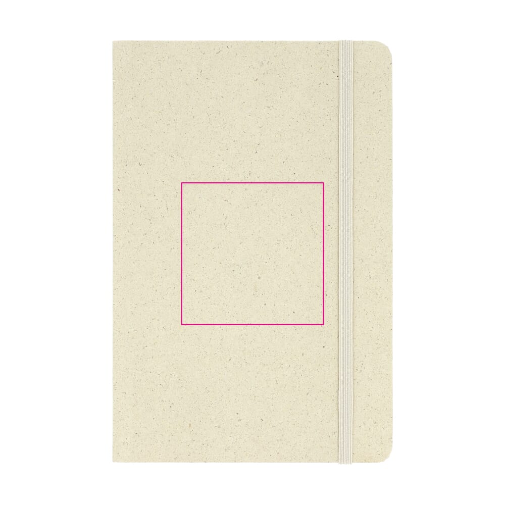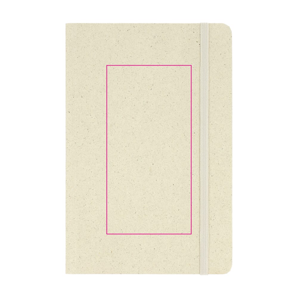 This sustainable A5 notebook features a cover made from grass fragment paper. It contains 80 sheets of FSC 70g/m² lined paper, with an elastic band closure and a ribbon bookmarker.