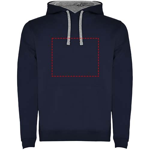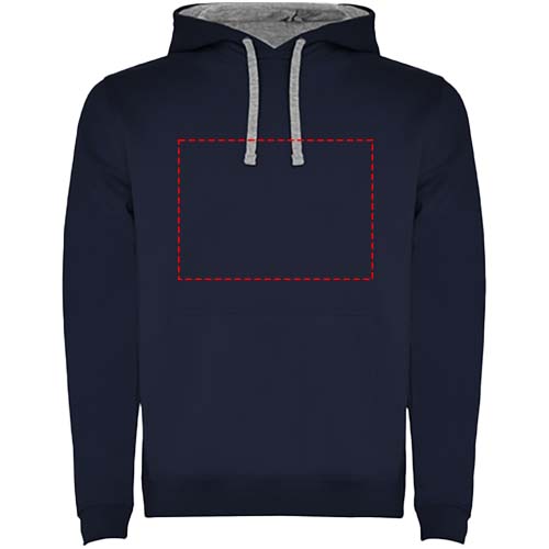 Hoodie with double fabric, adjustable drawcord, reinforced covered seams in collar and kangaroo style pocket. Available in uni-colours and two-tone colours. 1x1 elastane rib in cuffs and waistband. Removable label. The model is 185 cm and is wearing size M.